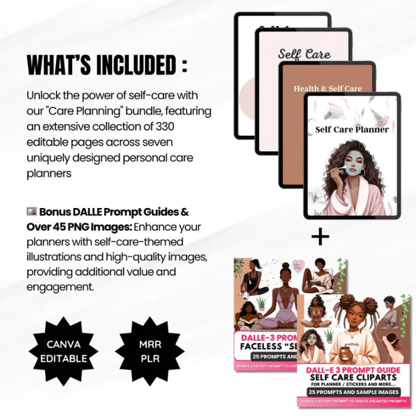 This bundle offers everything you need to create high-value self-care products that empower individuals to live healthier, more balanced lives. Whether you're purchasing for personal use or to build a business, these planners will make an impactful addition to your toolkit.